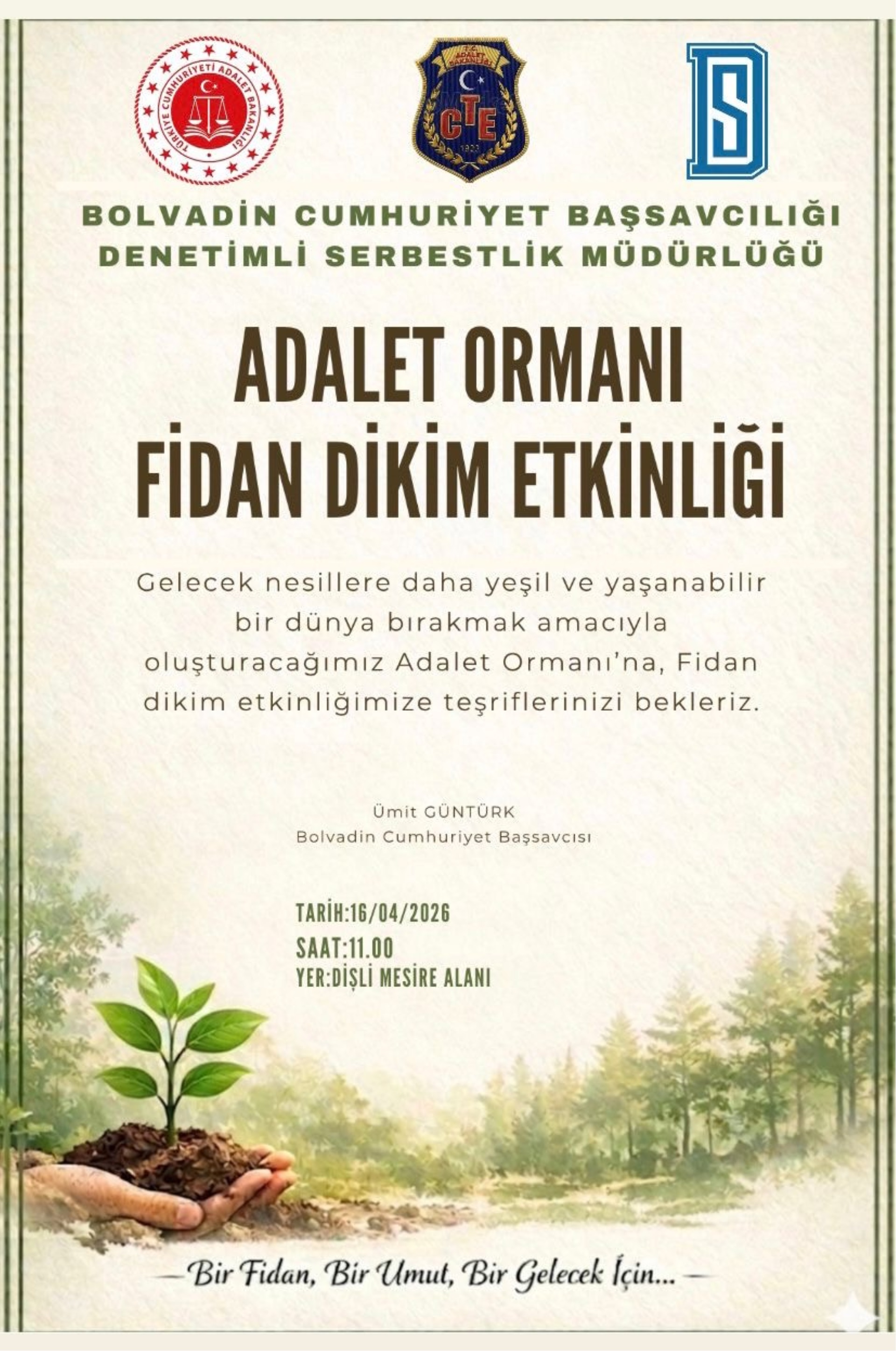 Yağışlar nedeniyle ertelenen Adalet Ormanı Fidan Dikim Etkinliği, 16 Nisan 2026 tarihinde saat 10.00’de Dişli Tepesi Mesire Alanı’nda gerçekleştirilecektir.
